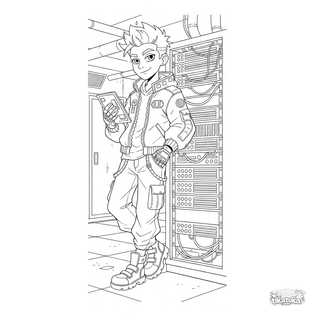 Ausmalbild für Kinder von 10-12 Jahren: Ein Hacker in Cyberpunk-Kleidung steht selbstbewusst an einem leuchtenden Server-Rack im Keller. Detaillierte Szene mit modischem Stil und Technik.