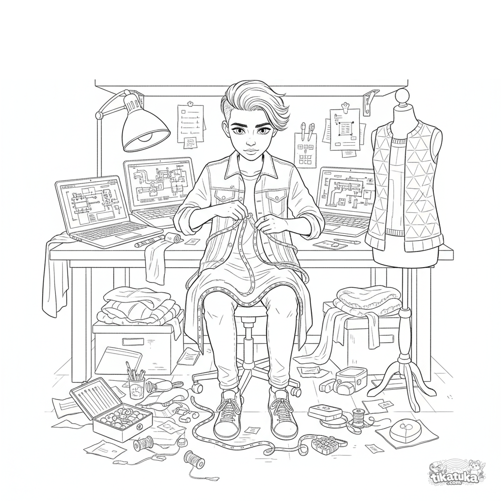 Ausmalbild für 10-12 Jahre: Ein Teenager im Hacker-Keller kreiert eine LED-Jacke. Detaillierte Werkzeuge, Stoffe und Schaltpläne für fesselndes Ausmalen.