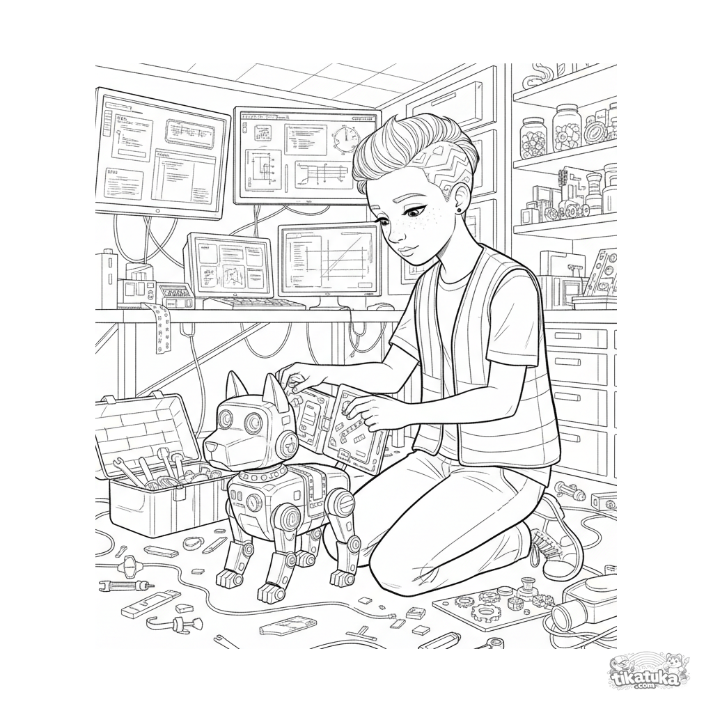 Ausmalbild für Kinder 10-12: ein Teen im Cyberpunk-Stil modifiziert einen Roboterhund in einer Kellerwerkstatt. Details: Werkzeuge, Kabel, Bildschirme mit Schaltplänen.