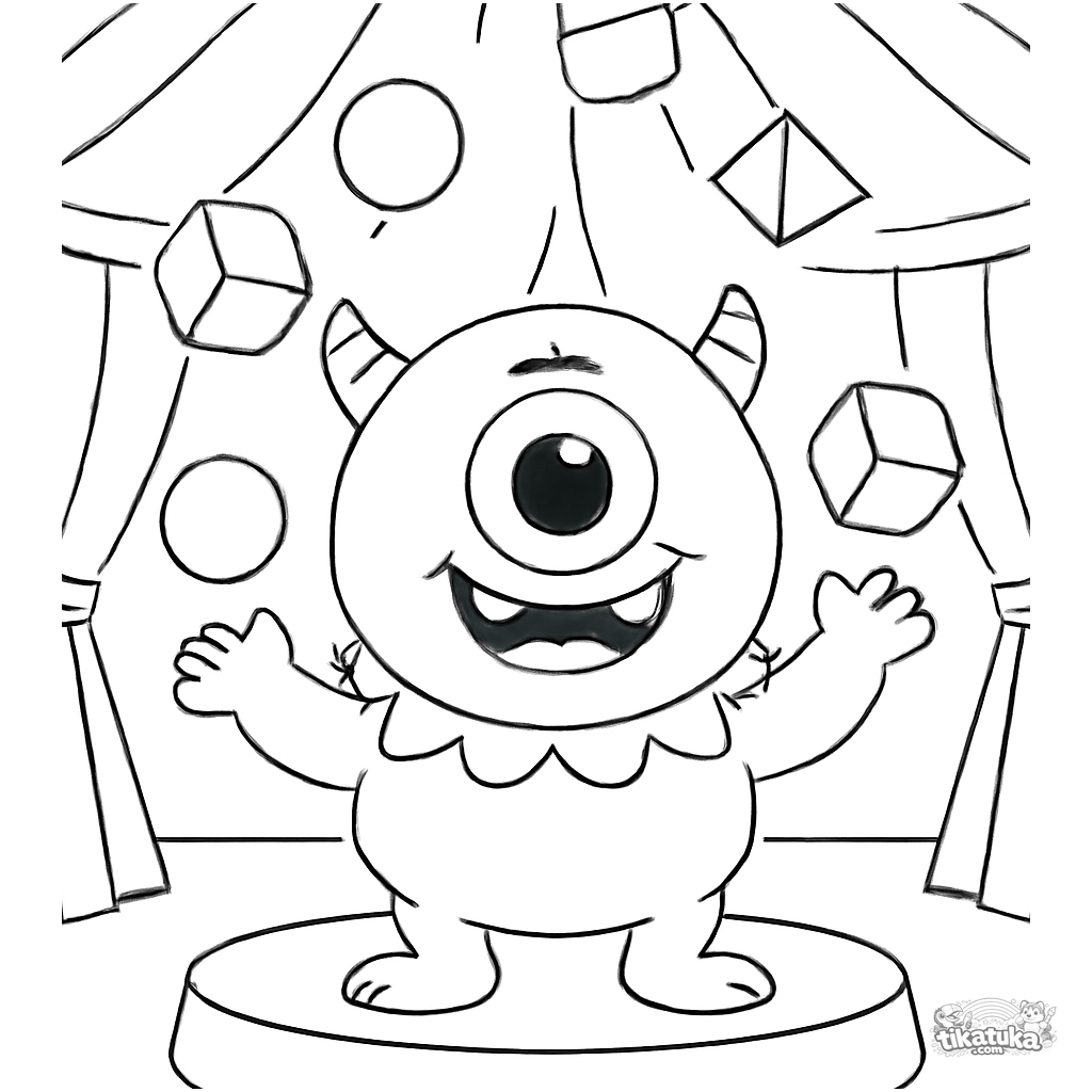Ausmalbild eines Zyklopen-Monsters, das mit geometrischen Formen auf einer Zirkusbühne jongliert. Für Kinder von 5-8 Jahren.