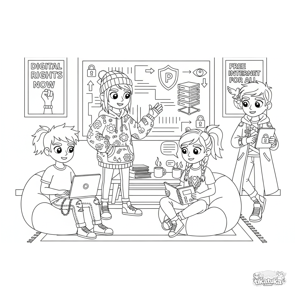 Ausmalbild für 10-12 Jahre: Ein Team von Krypto-Enthusiasten debattiert im Keller. Detaillierte Posen, Code-Tafel und intellektuelle Debattenatmosphäre zum Ausmalen.