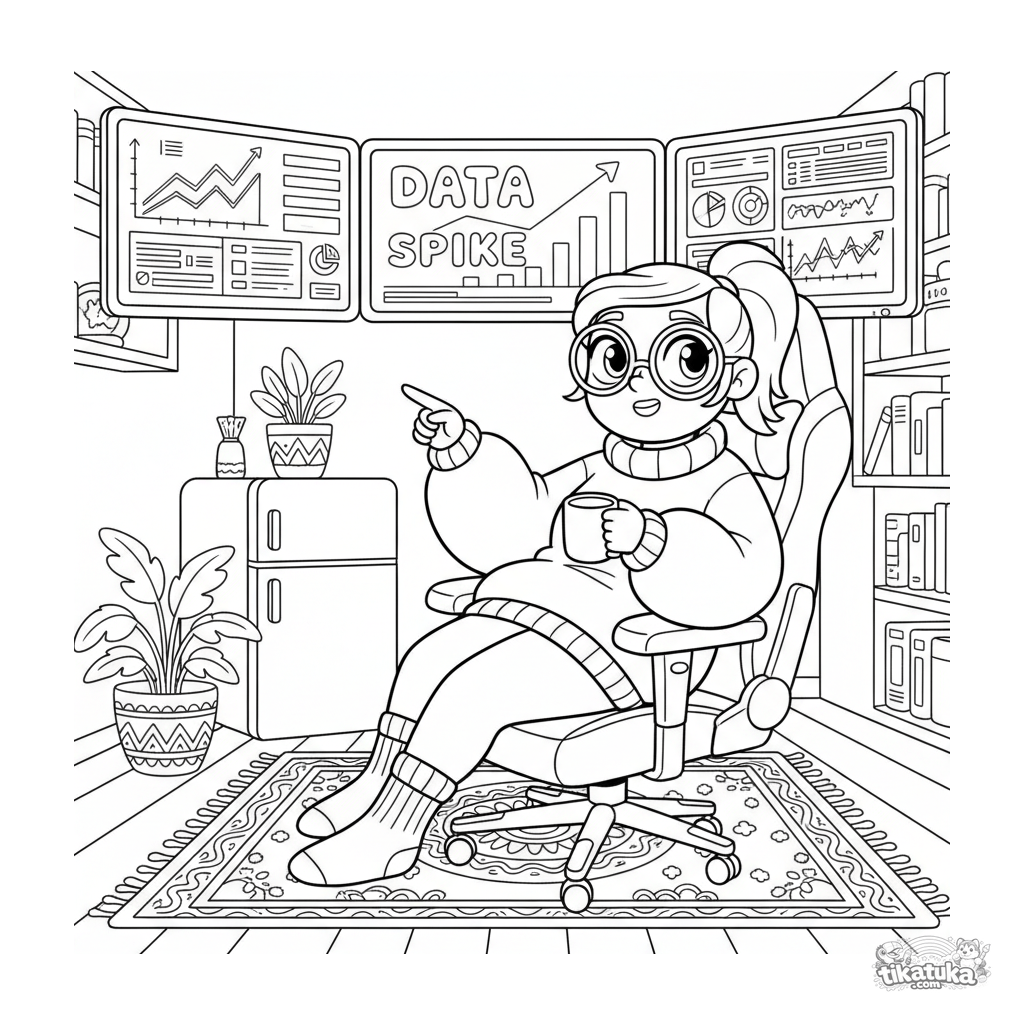 Ausmalbild für ältere Kinder: Ein Datenanalyst arbeitet mit Graphen auf mehreren Monitoren in seiner gemütlichen Kellerecke. Szene mit hohem Detaillierungsgrad.