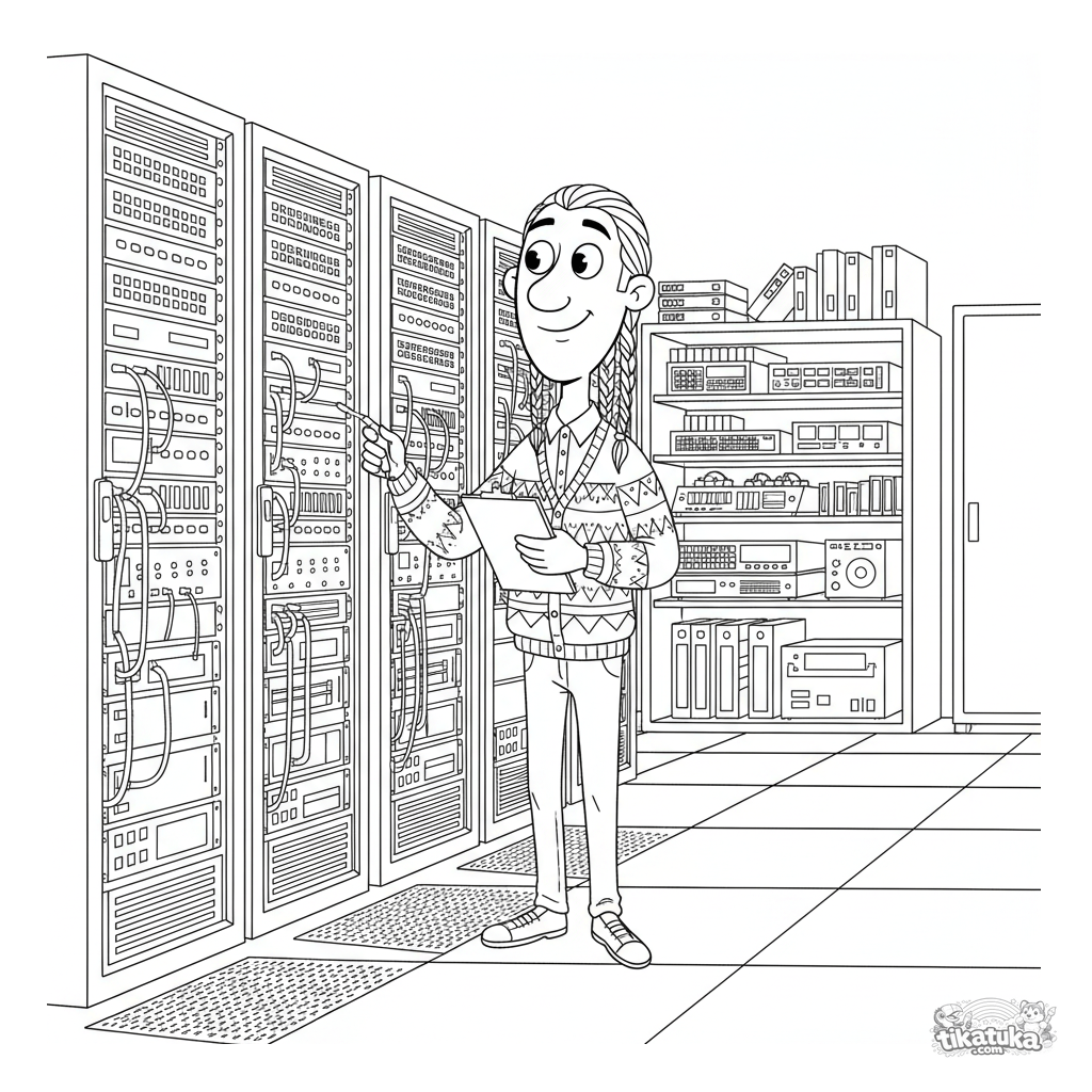 Hochdetailliertes Ausmalbild für 10-12 Jahre: Ein Datenarchivar arbeitet in einem sauberen Keller-Datentresor. Reihen von Server-Stapeln, Kabeltrögen, Anzeigelämpchen. Ruhige Szene.