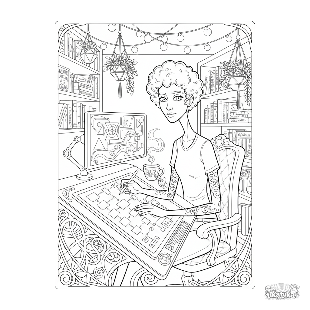 Stilvolles Art-Nouveau-Ausmalbild: Ein Künstler erstellt Datenvisualisierung in einer Kellerwohnung. Details: Tablet, Bildschirme, Bücher, Pflanzen.