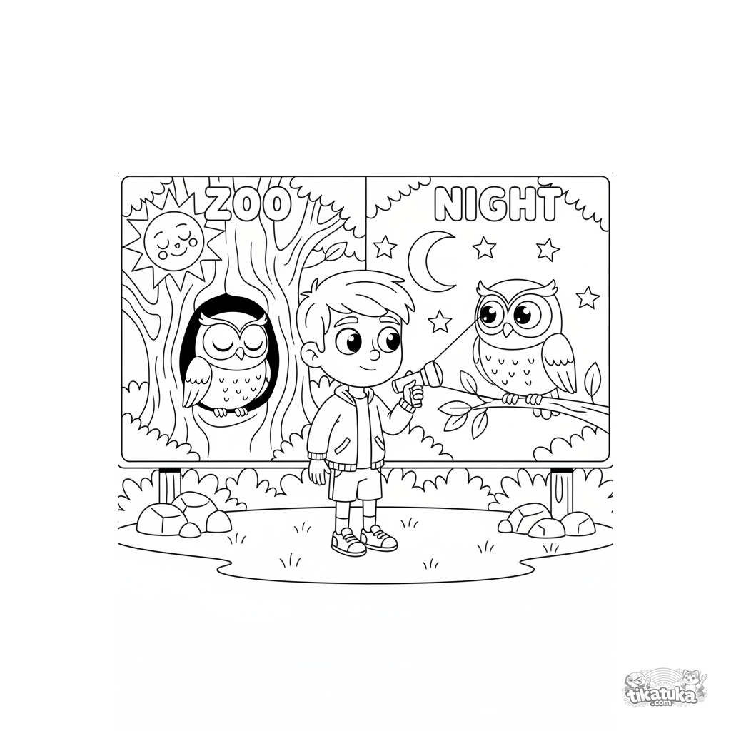 Ausmalbild für Kinder 7-9: Ein Zoo-Infoschild vergleicht die Aktivität einer Eule bei Tag und bei Nacht. Lehrreiche Szene über nachtaktive Tiere.