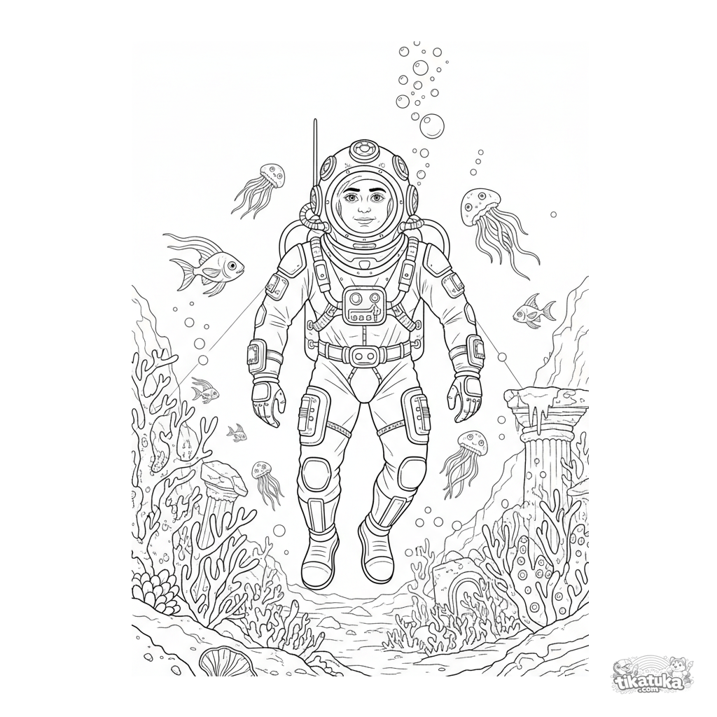 Detailliertes Unterwasser-Anime-Ausmalbild: Ein Taucher erkundet ein leuchtendes Korallenriff in der Tiefsee. Seltsame Fische, Quallen und alte Ruinen. Für Kinder von 10-12 Jahren.