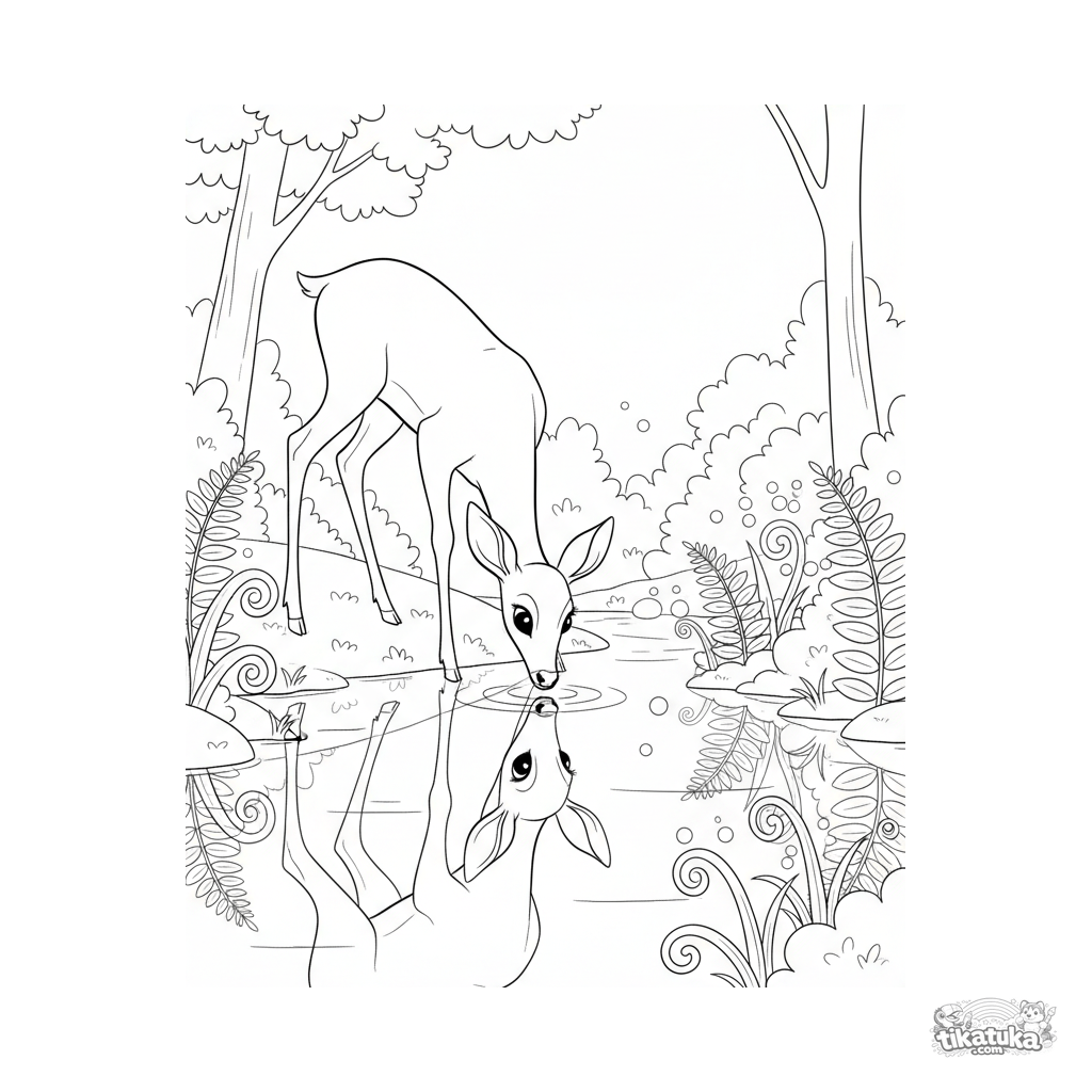 Ausmalbild für 7-9 Jahre: Ein anmutiger Hirsch trinkt aus einem Waldbach in der Abenddämmerung. Szene im Aquarell-Skizzen-Stil.