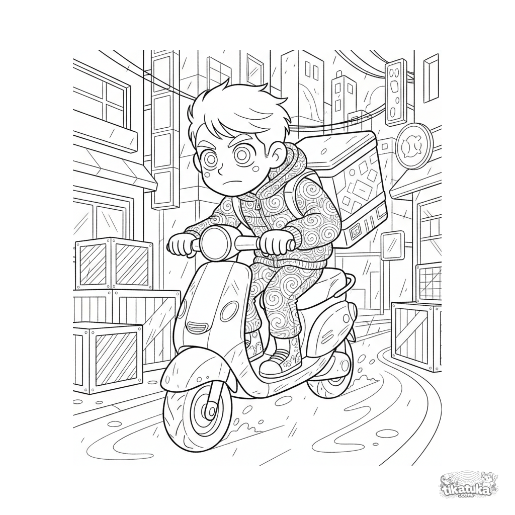 Energiereiches Manga-Action-Ausmalbild für 10-12 Jahre: ein Lieferjunge auf einem Hover-Scooter rast durch eine neonbeleuchtete Nachthallegasse, umkurvt Kisten und leuchtende Schilder mit einer Thermobox.