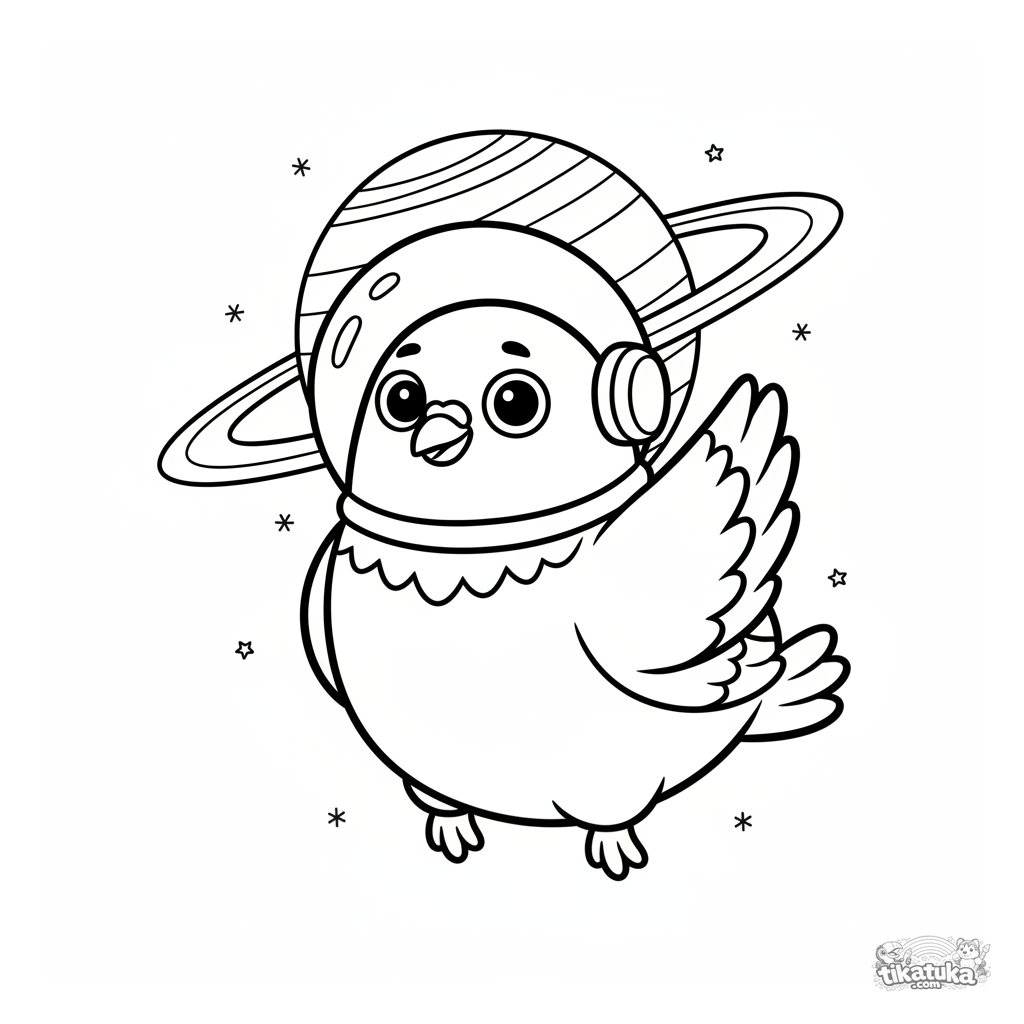Ausmalbild für Kinder 4-6: Ein lustiger Tauben-Astronaut schwebt in einem Raumanzug nahe einem Ringplaneten. Einfache Umrisse, breite Ränder.