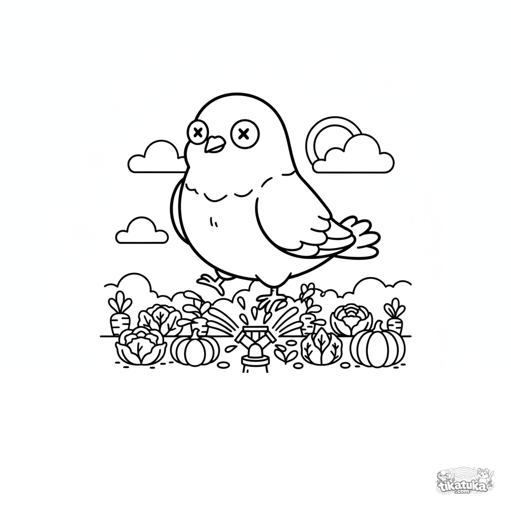 Ausmalbild einer lustigen Taube, die auf einem Gartensprenger balanciert. Eine verspielte Szene für Kinder von 4-6 Jahren. Klare Linien, einfache Formen und breite Ränder.