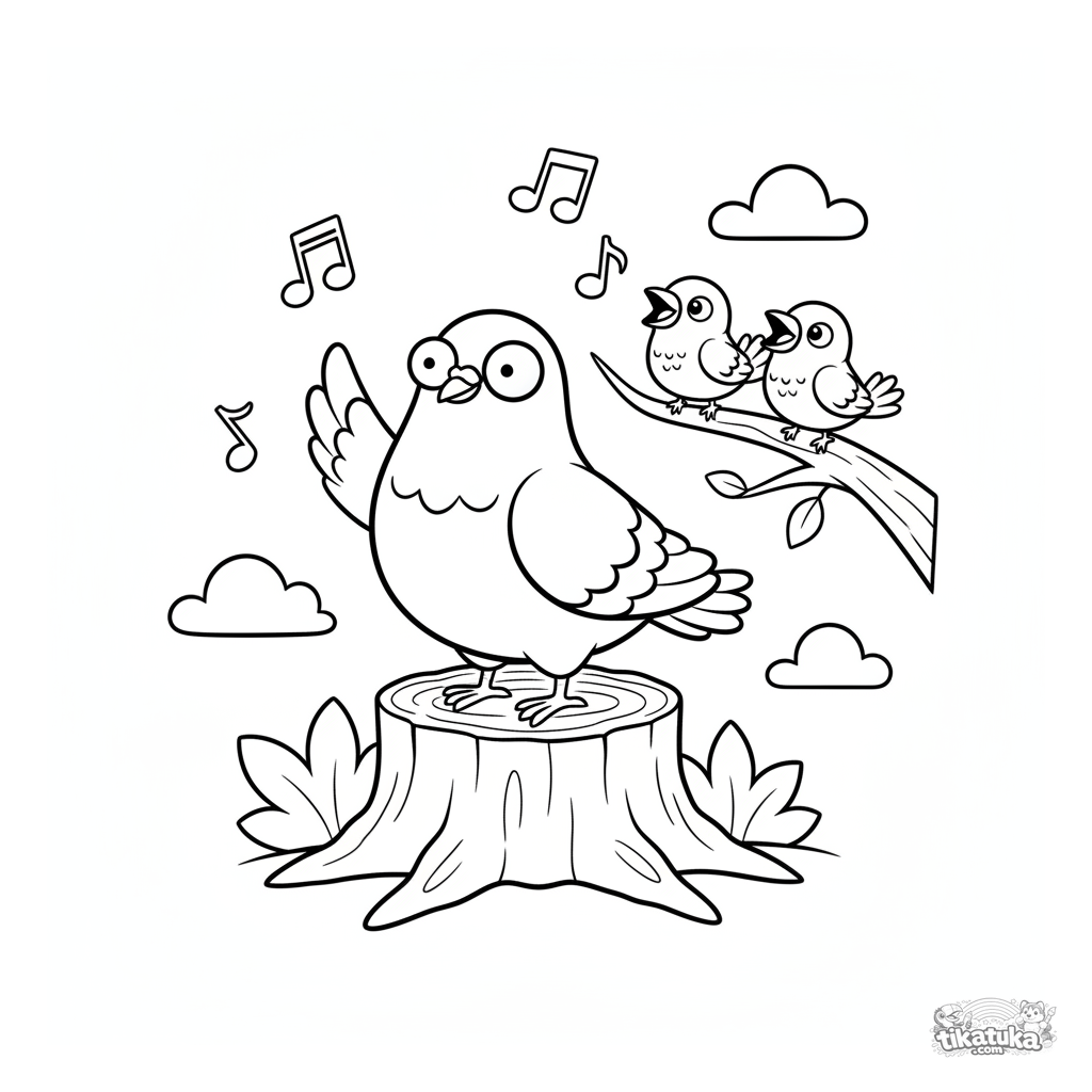 Ausmalbild: Eine lustige Taube dirigiert einen Spatzenchor auf einem Ast im Wald. Eine verspielte Musikszene für Kinder. Klare Umrisse, breite Ränder.