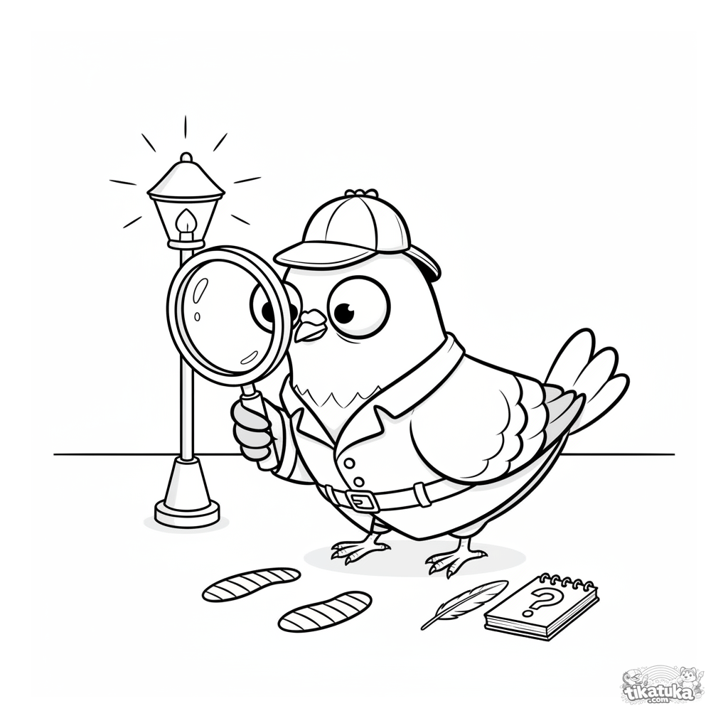 Ausmalbild für Kinder: Ein lustiger Taubendetektiv mit Hut und Mantel untersucht einen Fußabdruck mit einer Lupe. Spielzeugstil, breite Ränder, für 4-8 Jahre.