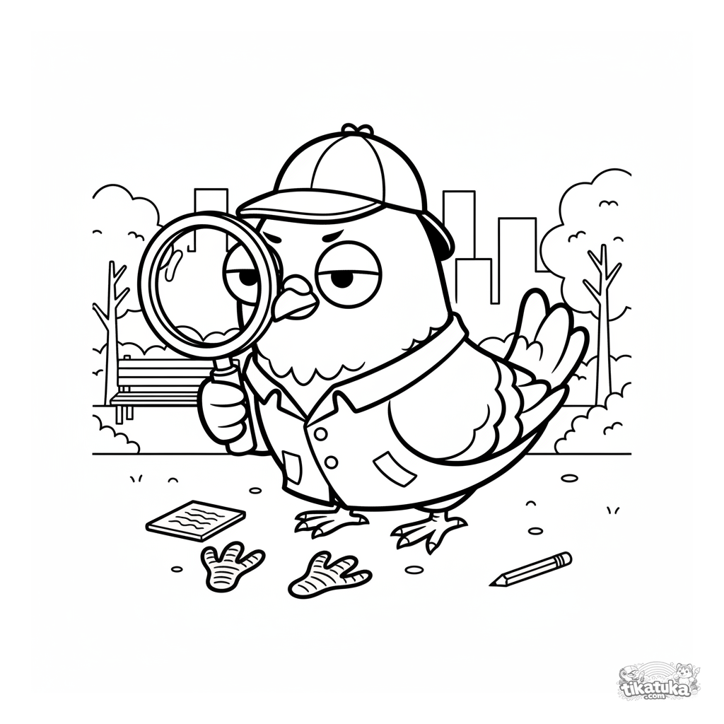 Ausmalbild eines Tauben-Detektivs, der eine Fußspur mit einer Lupe im Park untersucht. Für Kinder von 4-6 Jahren. Lustiger Vogel im Trenchcoat und Hut.