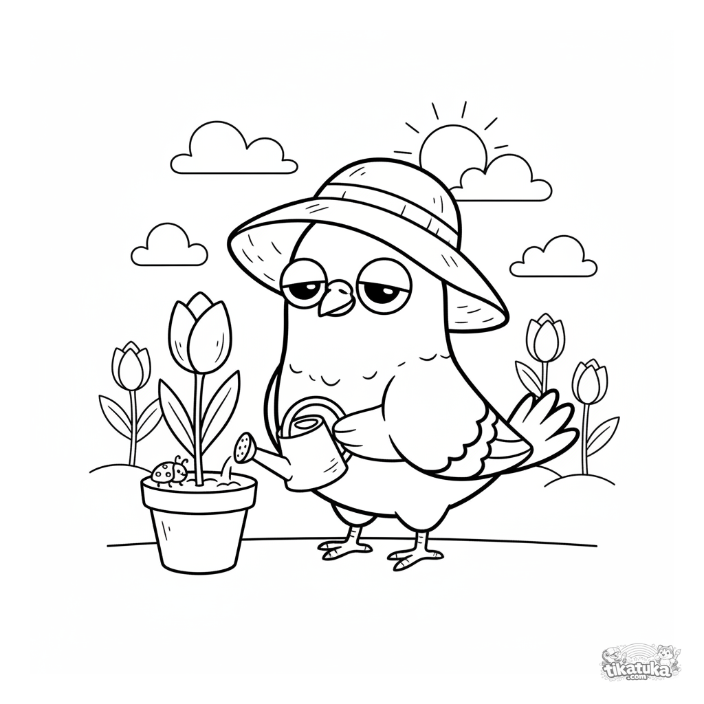 Ausmalbild für Kinder 4-6: Ein Tauben-Gärtner gießt eine Tulpe. Friedliche Szene, einfache Gießkanne, Marienkäfer, breite Ränder.