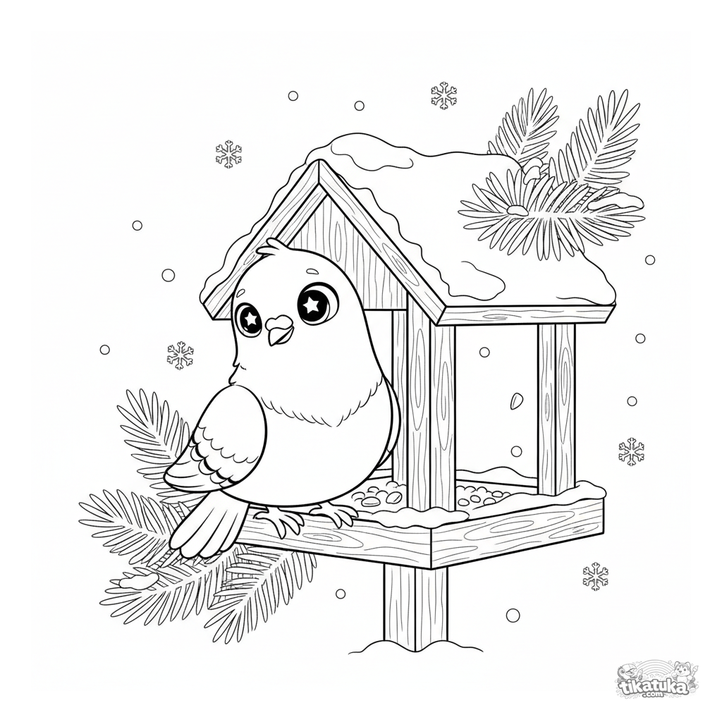 Winter-Ausmalbild mit einer Taube, die ein verschneites Vogelfutterhaus untersucht. Eine gemütliche Szene mit fallendem Schnee für Kinder im Vorschulalter.