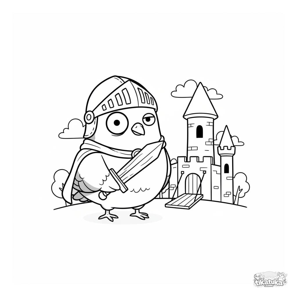 Ausmalbild für Jungen 4-6: Ein lustiger Taubenritter in Rüstung vor einer Burg. Klare Umrisse, sichere Proportionen.