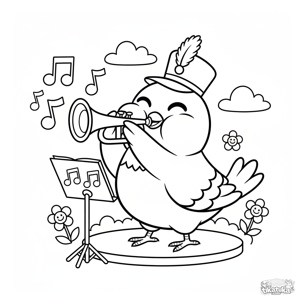 Ausmalbild für Kinder: Eine fröhliche Taube als Musiker bläst Trompete auf einer Musikkapelle. Plüschige Noten, einfache Formen, breite Ränder, für 4-8 Jahre.