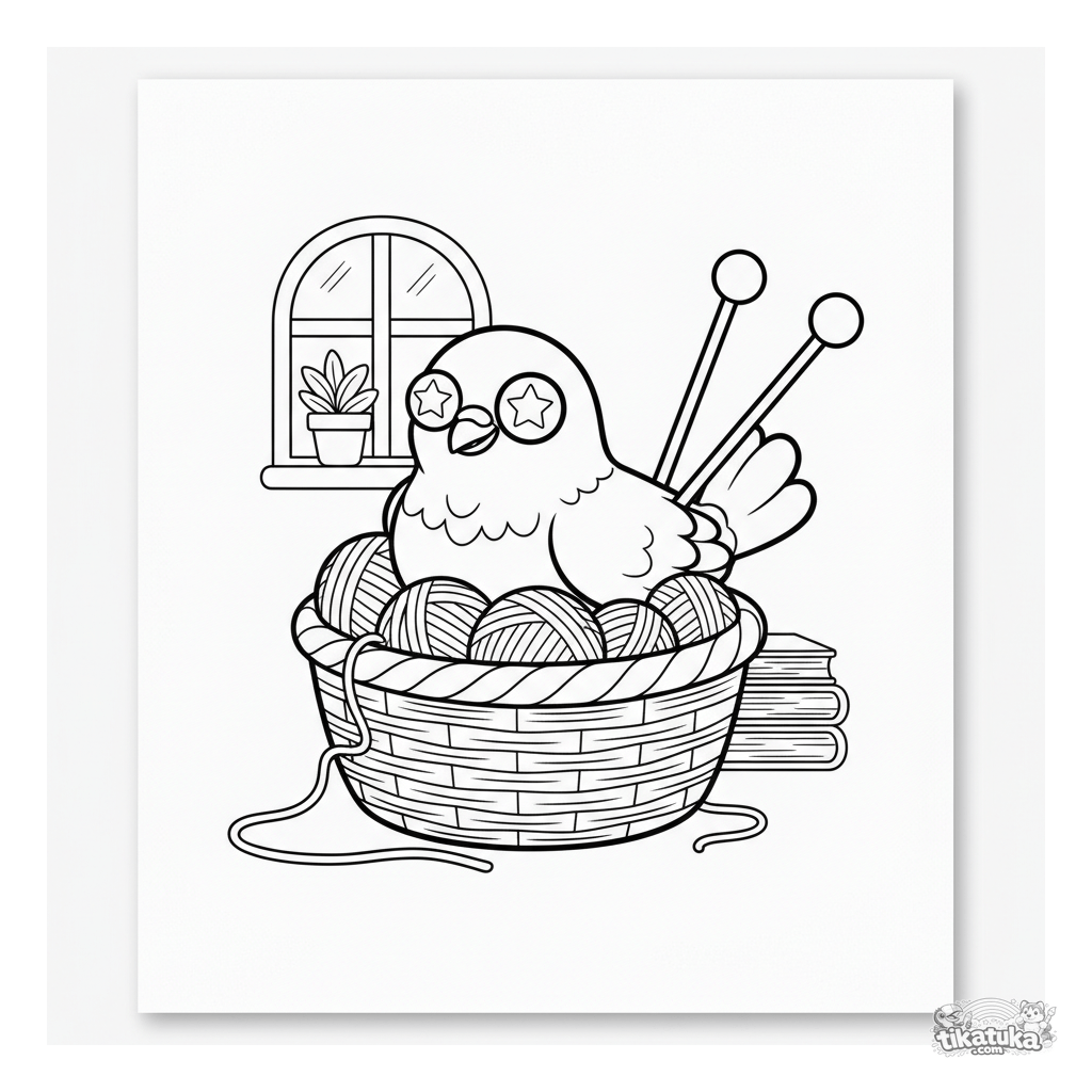 Ausmalbild einer Tölpel-Taube, die ein gemütliches Nest in einem Wollkorb baut. Für Kinder von 4 bis 6 Jahren.