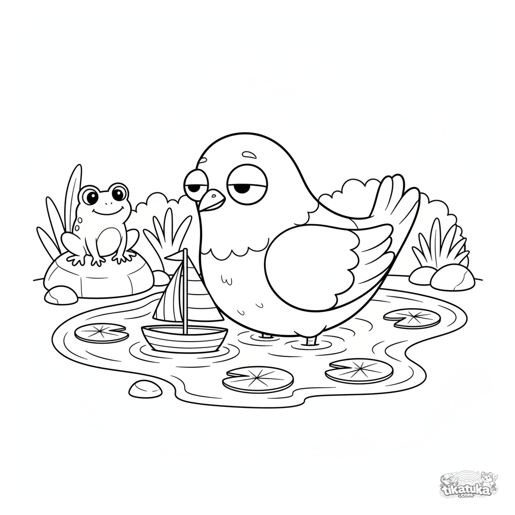 Ausmalbild: Eine süße Taube hilft einem Segelboot, auf einem Gartenteich zu schwimmen. Eine ruhige und freundliche Szene für Kinder von 4-6 Jahren.