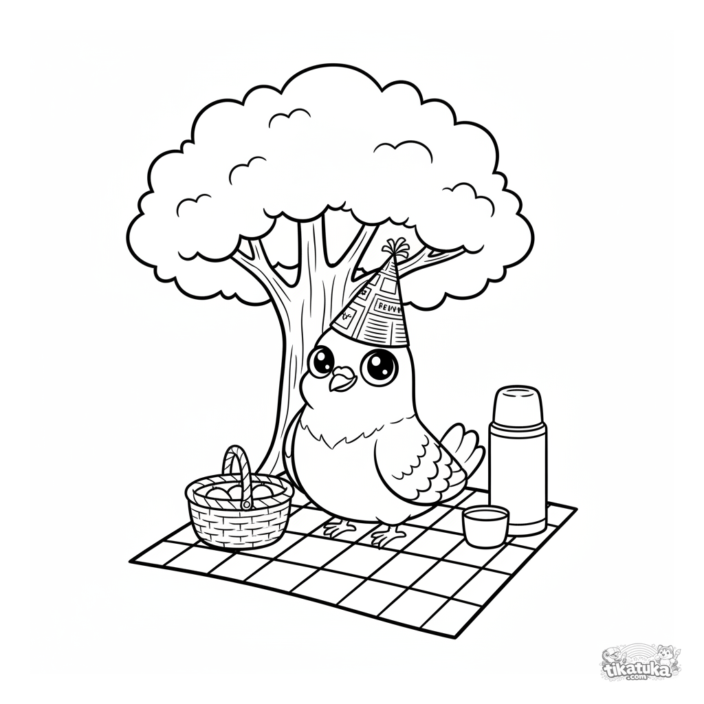 Ausmalbild einer Tölpel-Taube mit Papphut bei einem fröhlichen Parkpicknick. Für Kinder von 4 bis 6 Jahren.