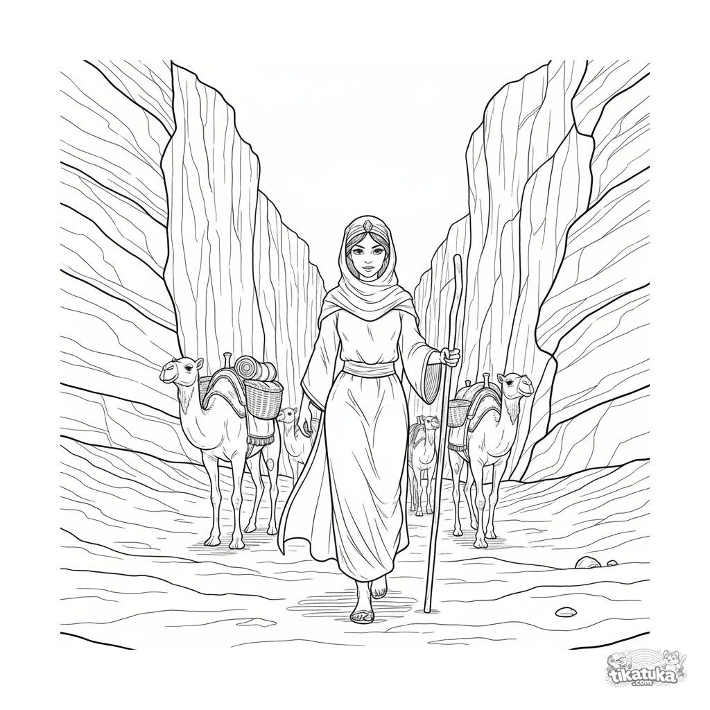 Ausmalbild für Kinder 7-9: Eine Wüstenprinzessin in Gewändern führt eine Kamelkarawane durch eine sandige Schlucht.