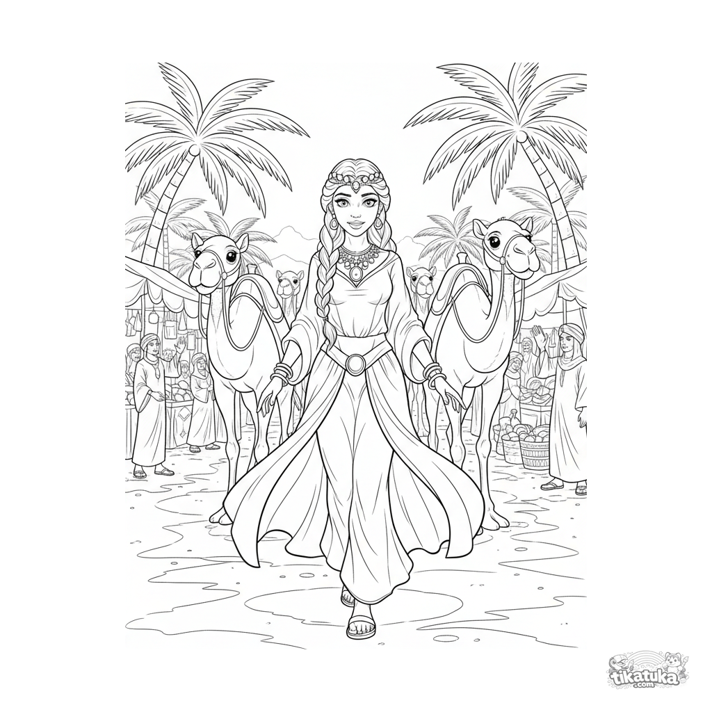 Ausmalbild für Kinder 7-9: Eine Wüstenprinzessin mit goldenem Schmuck führt Kamele durch einen geschäftigen Oasenmarkt. Fest- und Marktszene.