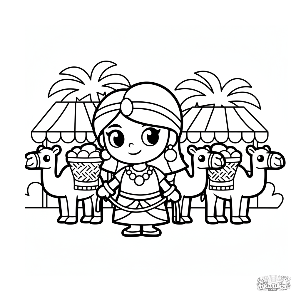 Ausmalbild für Kleinkinder 2-3: Eine Wüstenprinzessin führt Kamele durch eine Oase. Große einfache Formen, klare Umrisse, viel Platz zum Ausmalen.