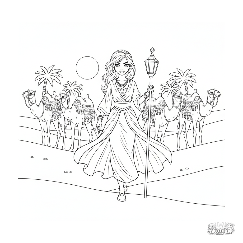 Ausmalbild für Kinder 7-9: eine Wüstenprinzessin führt eine Kamelkarawane bei Sonnenaufgang über Dünen zu einer Oase.