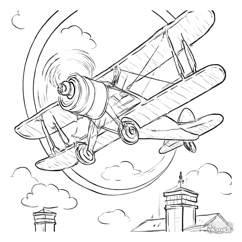 Detailliertes Ausmalbild eines Doppeldeckers der 1930er Jahre bei einem Looping. Für Kinder von 8-12 Jahren. Realistisches, komplexes Bild des gesamten Flugzeugs.