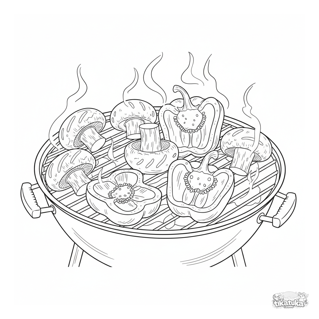 Detailliertes Ausmalbild für ältere Kinder von 10-12 Jahren: eine Auswahl an Pilzen und Paprika auf einem Gartengrill. Realistische Texturen, Hitzeeffekt.