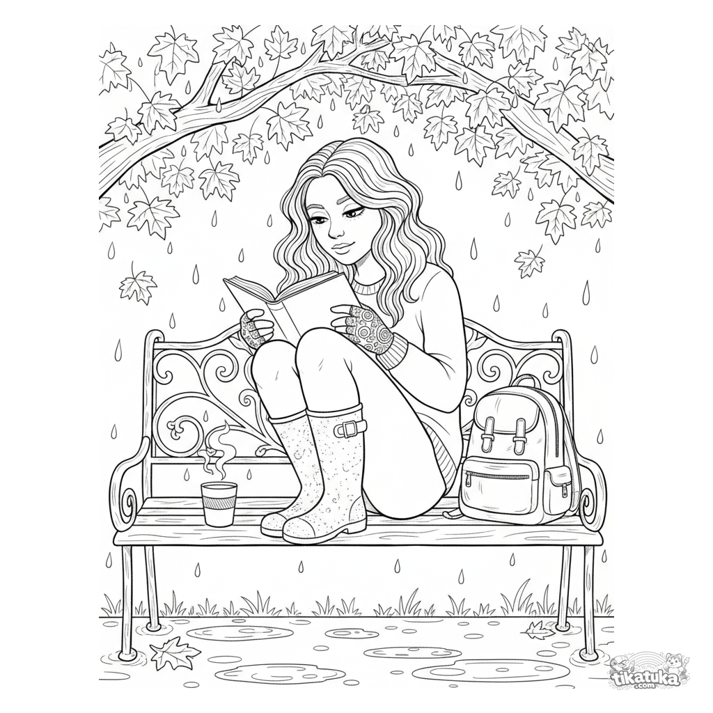 Ausmalbild für ältere Kinder 10-12 Jahre: ein Jugendlicher liest ein Buch auf einer Bank im Herbstpark im Regen. Detaillierte Szene mit Blatttexturen und Accessoires.