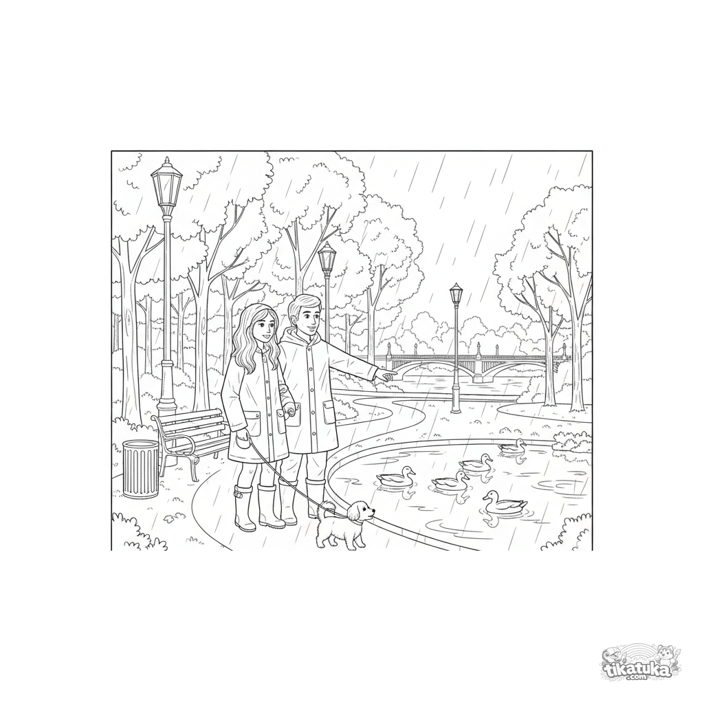 Detailliertes Ausmalbild für ältere Kinder 10-12: Eine Szene in einem Herbstpark im Regen. Eine Familie in Regenjacken geht mit einem Hund spazieren, Enten sind in einem Teich, mit Bänken und Laternen. Viele Elemente zum Ausmalen.