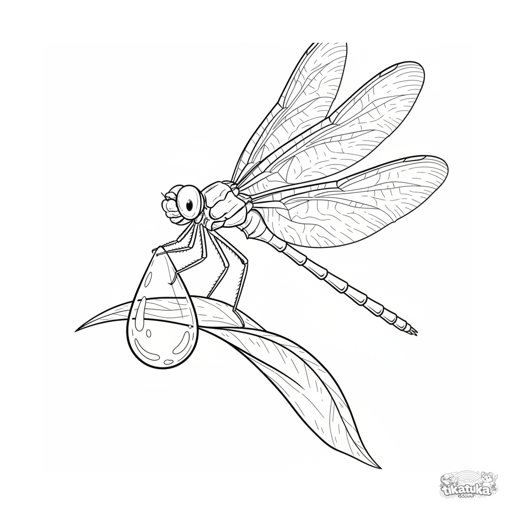 Detailliertes Ausmalbild für ältere Kinder 10-12: Eine realistische Libelle mit gemusterten Flügeln thront auf einem großen Tautropfen auf einem Blatt. Viele feine Elemente zum Ausmalen.