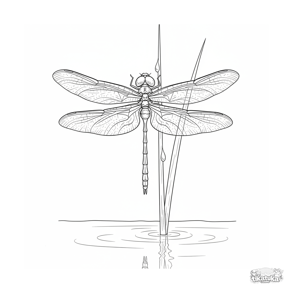 Kompliziertes Ausmalbild im Vintage-Stich-Stil für 10-12 Jahre: Eine detaillierte Libelle ruht auf einem Schilfrohrstängel am Rand eines ruhigen, klaren Baches.