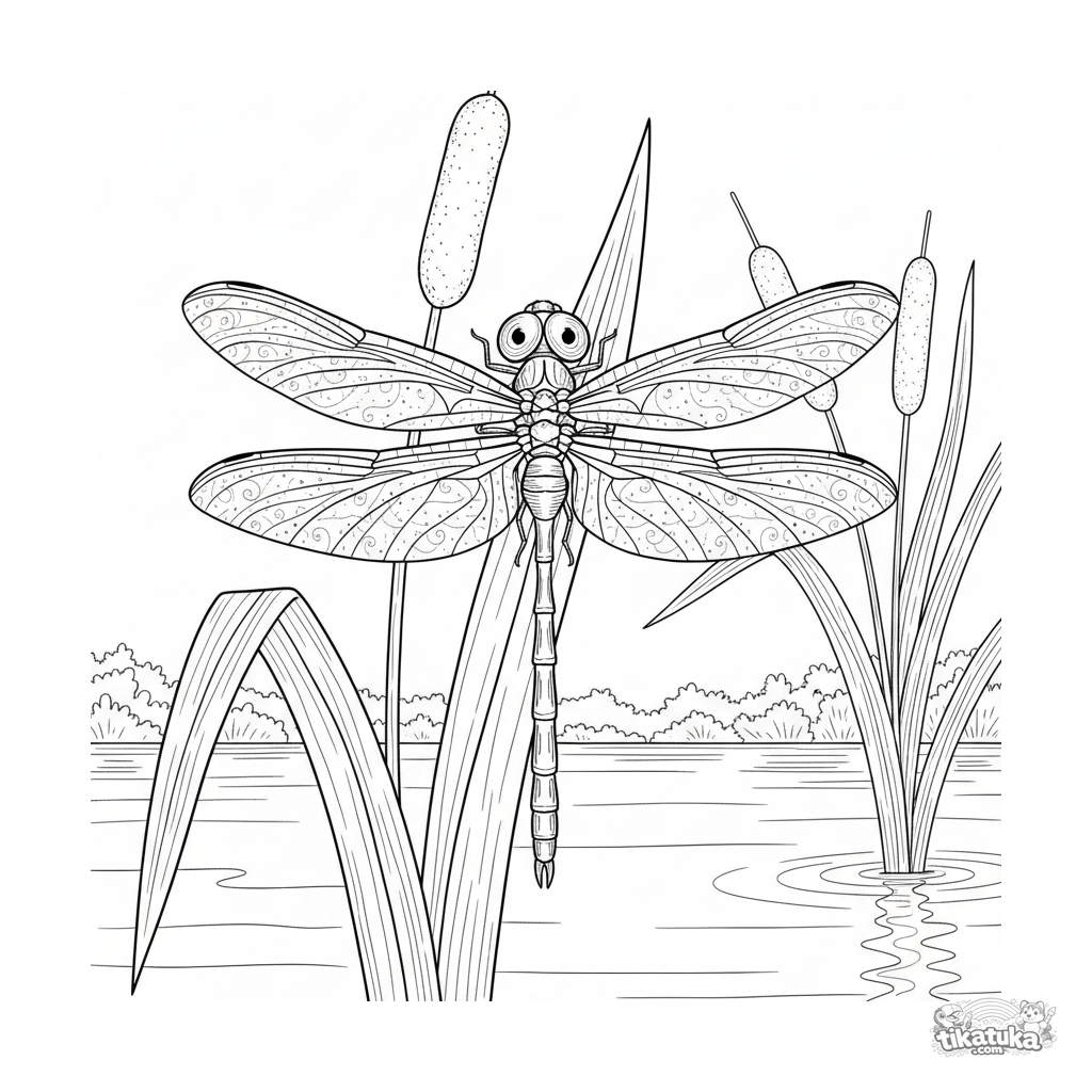 Detailliertes Ausmalbild für ältere Kinder 10-12 Jahre: eine Libelle mit zarten Flügeln sitzt auf einem breiten Rohrkolbenblatt am Ufer eines klaren Bachs, mit anderen Stängeln und Wasserspiegelungen.