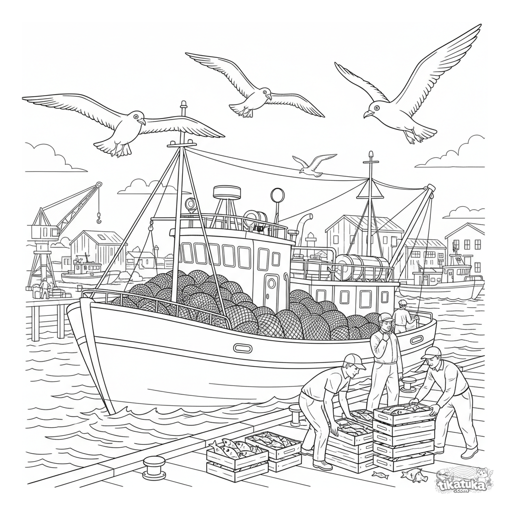 Detailliertes Ausmalbild für ältere Kinder 10-12: Ein Fischereitrawler lädt seinen Fang an einem Hafenkai aus, mit Netzen an Deck, kreisenden Möwen und Hafenarbeitern, die Kisten bewegen.