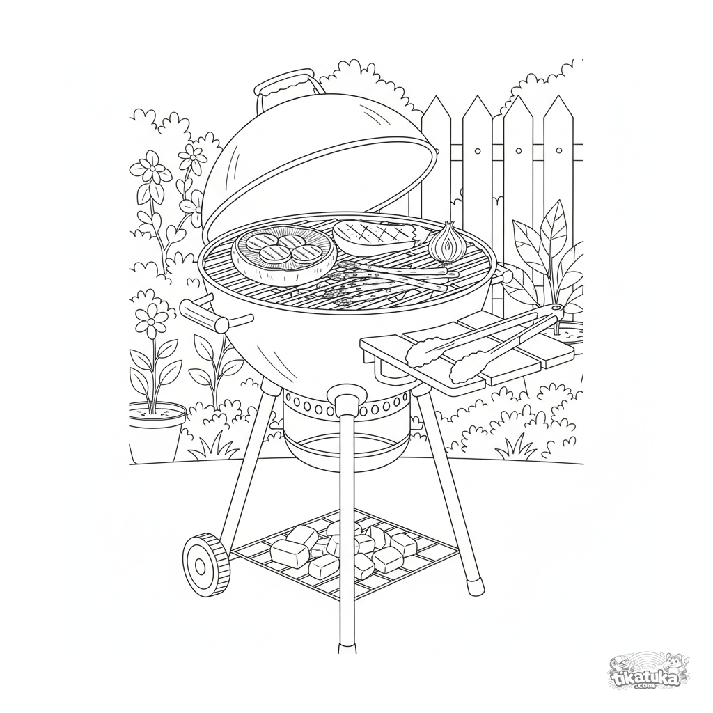 Detailliertes Ausmalbild für Kinder von 10-12 Jahren: ein Gartengrill beladen mit verschiedenen Gemüsesorten. Zeigt Pilze, Aubergine, Spargel, Zwiebel und Grillwerkzeug.