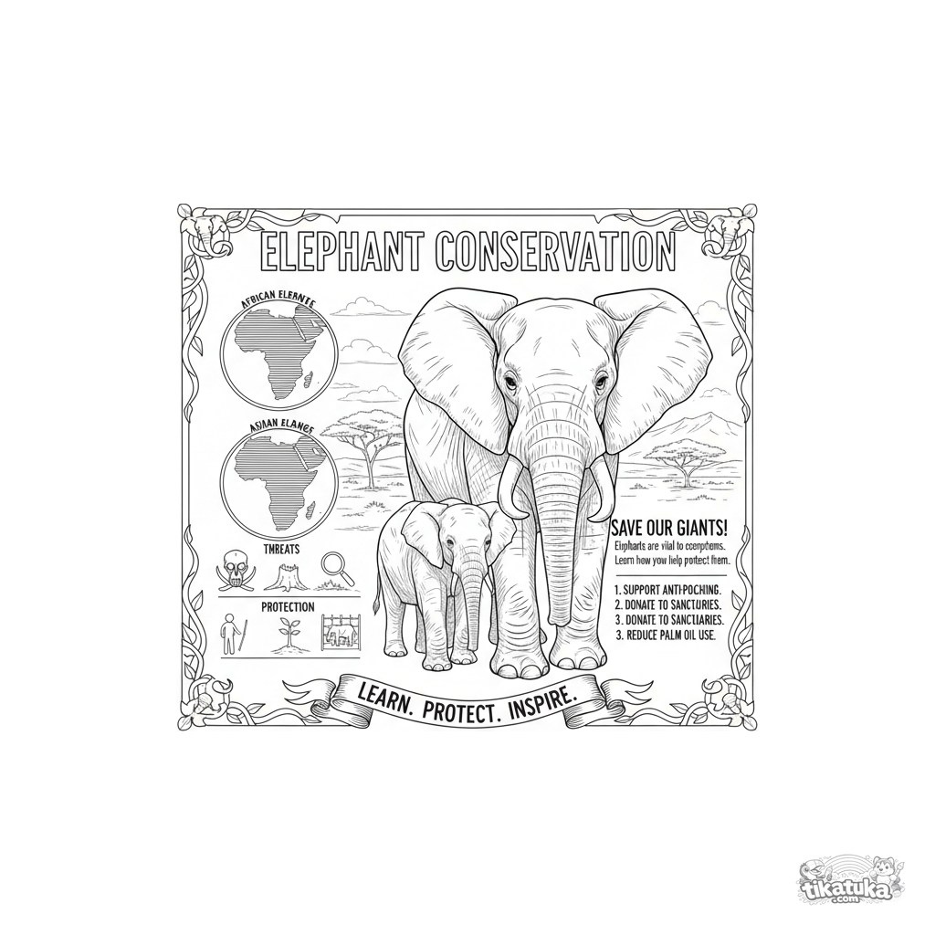 Ausmalbild für Kinder 10-12: Ein detailliertes Informationsschild über Elefantenschutz im Zoo. Komplexe pädagogische Illustration mit Karten und Fakten für geduldige Künstler.