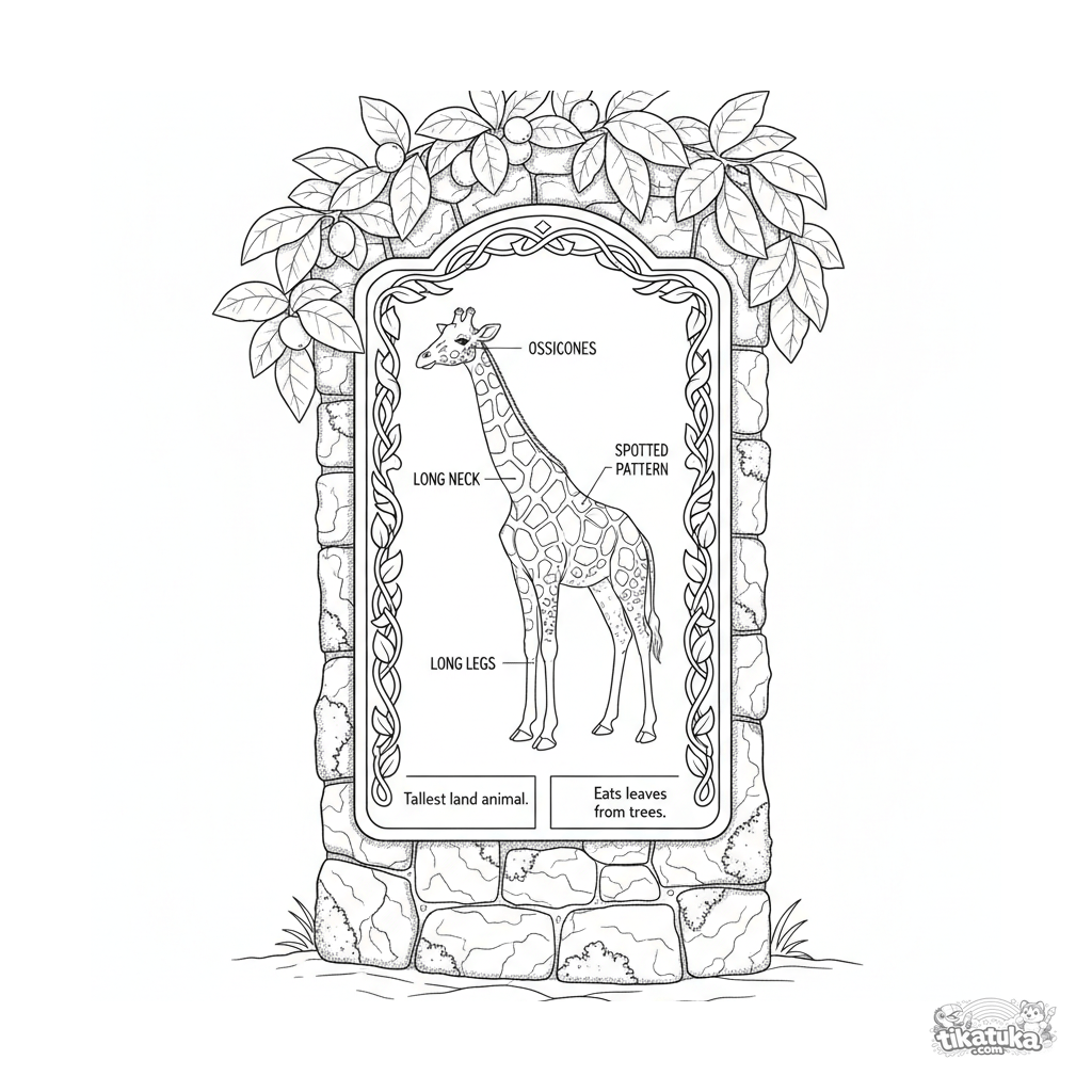 Detailliertes Ausmalbild für Kinder von 10-12 Jahren: eine Informationstafel mit einem anatomischen Diagramm einer Giraffe im Zoo.