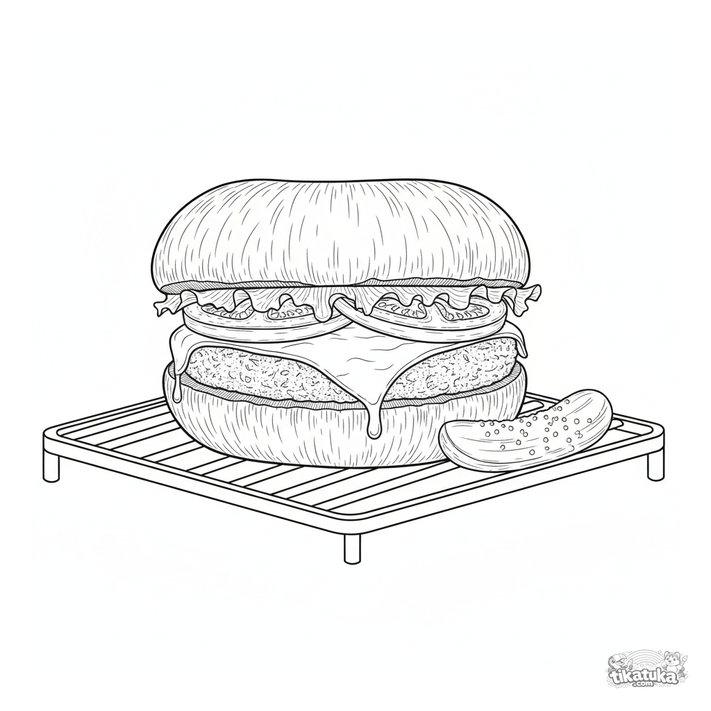 Detailliertes Ausmalbild für 10-12 Jahre: ein Portobello-Pilz-Burger auf einem Gartengrill. Klare Umrisse, realistische Details.