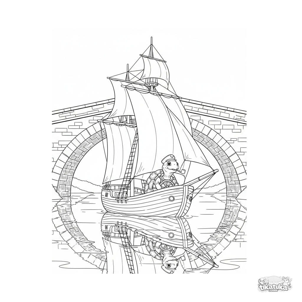 Ausmalbild für ältere Kinder 10-12: Ein detailliertes Holz-Segelboot fährt unter dem Bogen einer Steinbrücke über einen breiten Fluss. Ein Schildkrötenkapitän steht am Steuer. Saubere, präzise Linien, friedliche Atmosphäre.