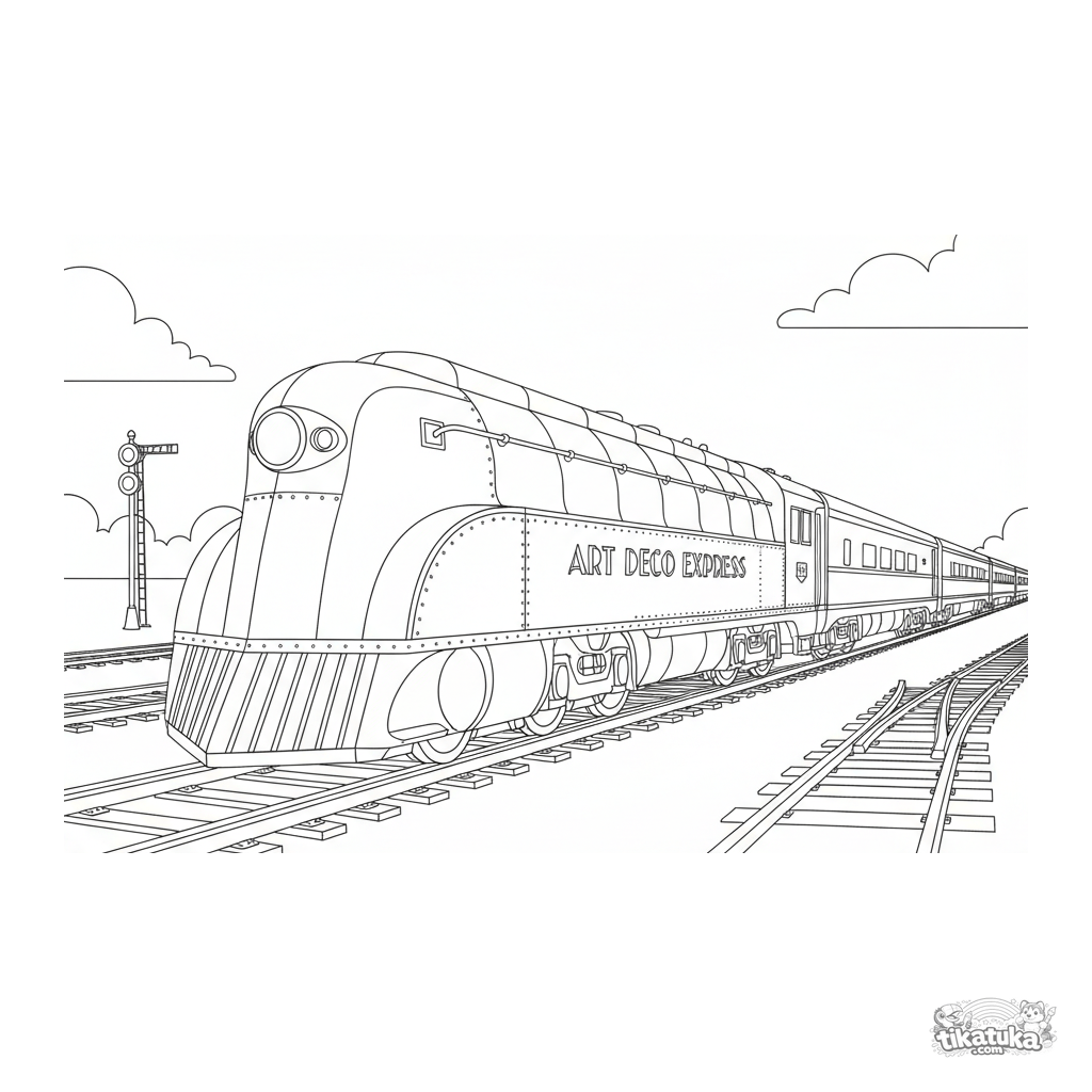 Anspruchsvolles Ausmalbild für Kinder von 8-12 Jahren: Eine detaillierte Art-Deco-Streamliner-Lokomotive der 1930er Jahre. Realistische Illustration für Fahrzeugfans.