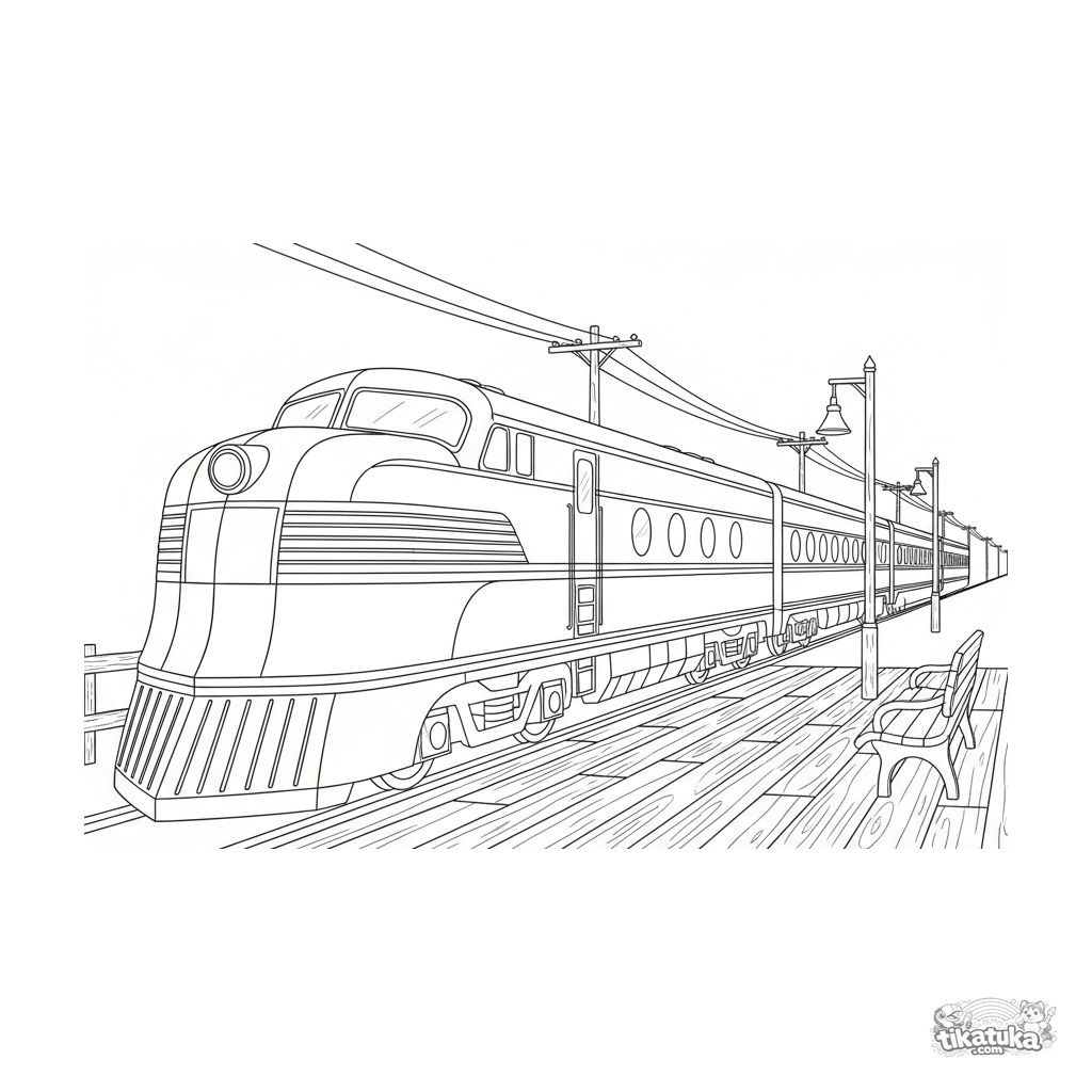 Detailliertes Ausmalbild eines Retro-Streamliner-Zugs der 1930er Jahre an einem kleinen Landbahnhof. Für Kinder von 8 bis 12 Jahren.