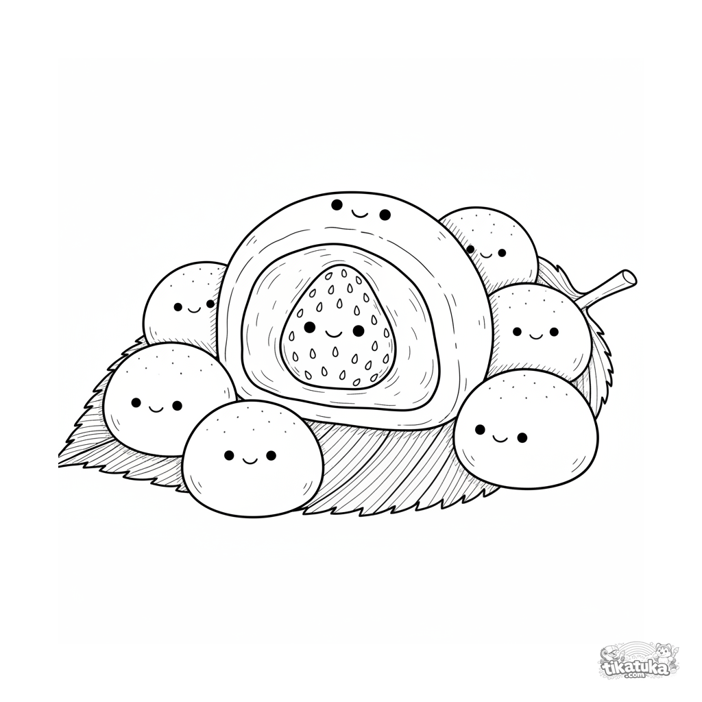 Detailliertes Ausmalbild eines Erdbeer-Mochi-Querschnitts, der die Bohnenpaste und Füllung zeigt. Lehrreiches und komplexes Design für 10-12 Jahre.