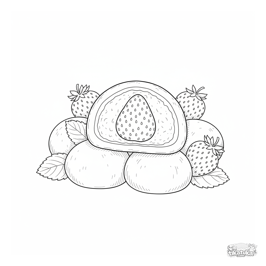 Komplexes Ausmalbild für ältere Kinder 10-12: Ein realistischer Querschnitt eines Erdbeer-Mochi, der Bohnenpaste und Erdbeerfüllung zeigt. Detaillierte Illustration im populärwissenschaftlichen Stil.