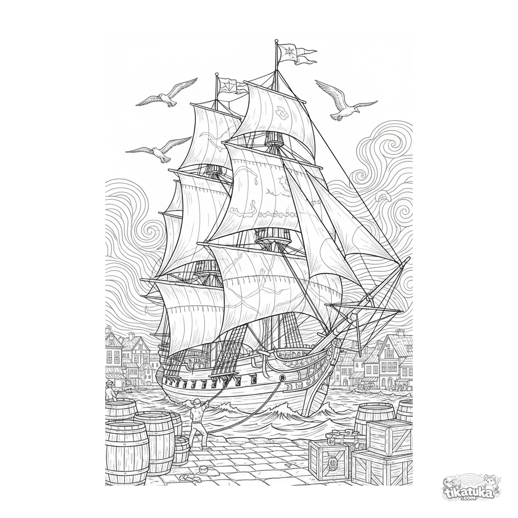 Komplexes Ausmalbild für ältere Kinder 10-12: Ein detaillierter Großsegler kommt bei Sonnenuntergang im Hafen an. Viele Takelage-Elemente und Hintergrund.