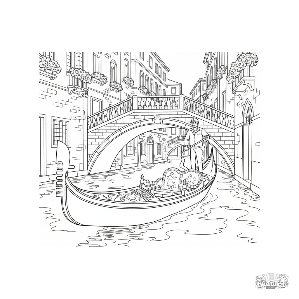 Detailliertes Ausmalbild für ältere Kinder 10-12: Eine kunstvolle venezianische Gondel fährt unter einer Steinbrücke auf einem historischen Kanal, gesäumt von Gebäuden mit überquellenden Blumenkästen.