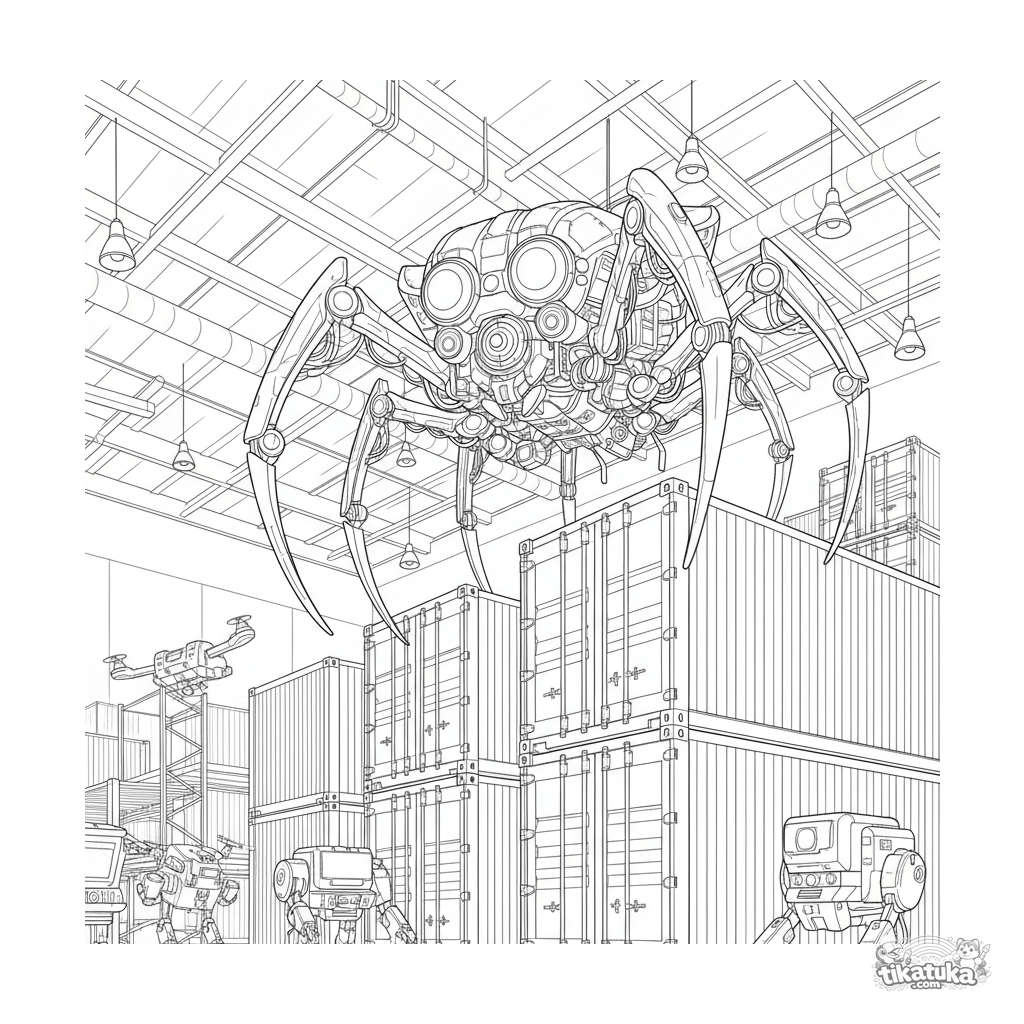 Komplexes Ausmalbild für ältere Kinder 10-12: Eine detaillierte Spinnen-Drohne überwacht ein Lagerhaus von Containern aus. Drohnen unten. Hohes Detailliveau.