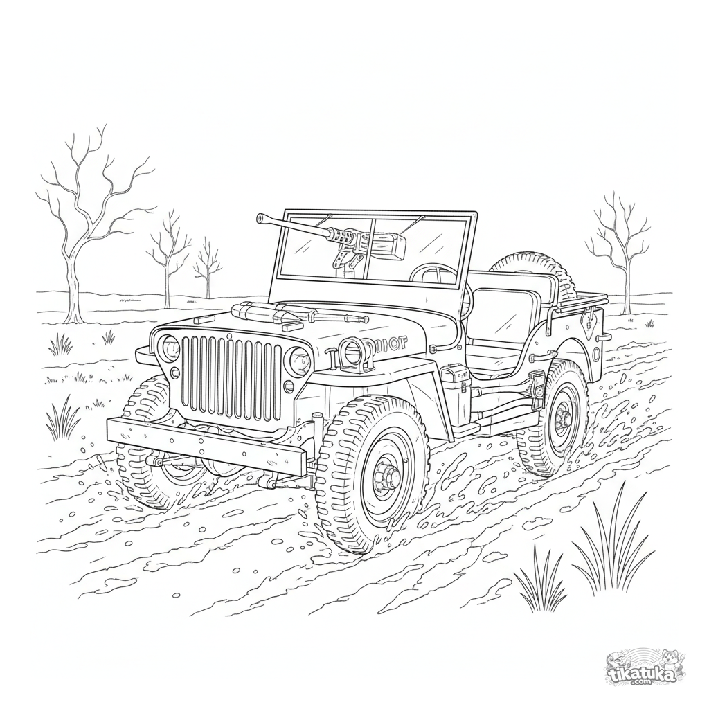 Schwieriges Ausmalbild für Jungen 7-12 Jahre: Ein detaillierter Armee-Jeep aus dem 2. Weltkrieg fährt durch ein schlammiges Feld. Realistischer Stil.