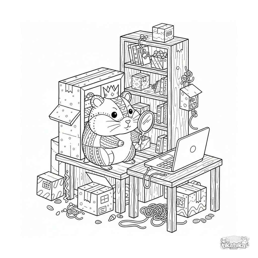 Ausmalbild im Doodle-Stil: Ein entschlossener Hamster mit Krone spioniert mit einem Spiegel aus einer Pappburg einem Laptop nach. Lustiges und detailliertes DIY-Meme für Kinder 10-12.
